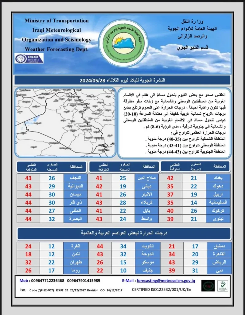 غداً.. حرارة 6 محافظات عراقية تتجاوز الـ42 درجة و8 أخرى تلامس الـ50توقعت هيئة الأنواء الجوية، ارتفاع درجات الحرارة في المحافظات العرلقية حتى تتجاوز الـ45 وبعضها تلامس الـ50.